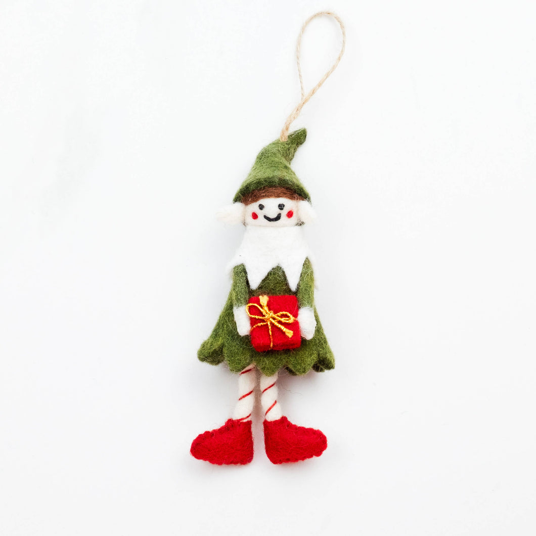 A few elves to hang on the shelf or tree or wherever a little joyful elf ornament is needed. Set of 6 assorted, 2 each in the colors shown. Unique ornaments for a holiday tree, to tie onto beautifully wrapped gifts or hang on cupboard nobs. Made from 100% natural wool; no harsh chemicals are used during production. We take a portion of the profits from our felt business to pay full school tuition for our felt workers' children.
