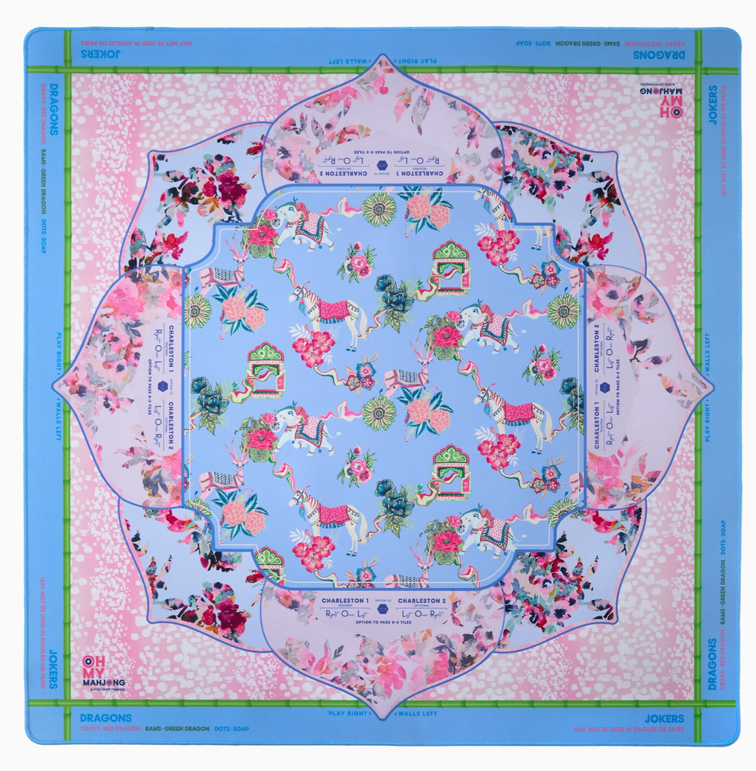 Introducing the Vivara Mat — a vibrant and whimsical celebration of pattern and play, designed for the Mahjong enthusiast who loves bold beauty with a worldly twist. Featuring a charming mix of elephants, blooming florals, and painterly antelope print in shades of soft pinks and layered blues, this mat brings an elevated sense of joy and wanderlust to your game night aesthetic. It’s artful yet playful — a visual escape that feels part garden fête, part global adventure.