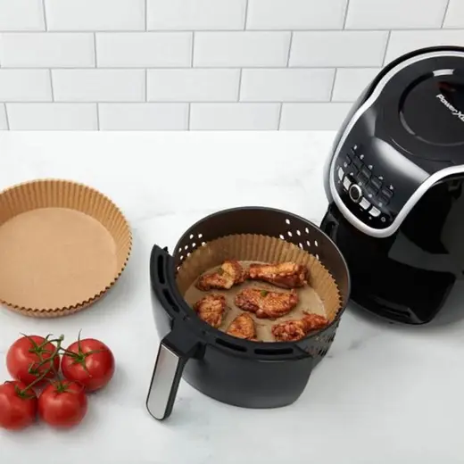 HIC Kitchen's Air Fryer Liners keep foods, oils, glazes, and sauces from sticking to the cooking basket to keep air fryers clean. Thicker than standard parchment paper (0.04-milimeter) to lift liner and cooked foods without it tearing; absorbs cooking oils for healthier cooking. Fits 3 to 5-quart air fryer baskets; won't block hot air circulation; safe for oven (to 425-degrees Fahrenheit), multi cooker, and microwave. They are non-stick, waterproof, oil proof, single-use and disposable for easy cleanup, compostable, and fully biodegradable. Not intended for broiler, grill, or direct flame.
