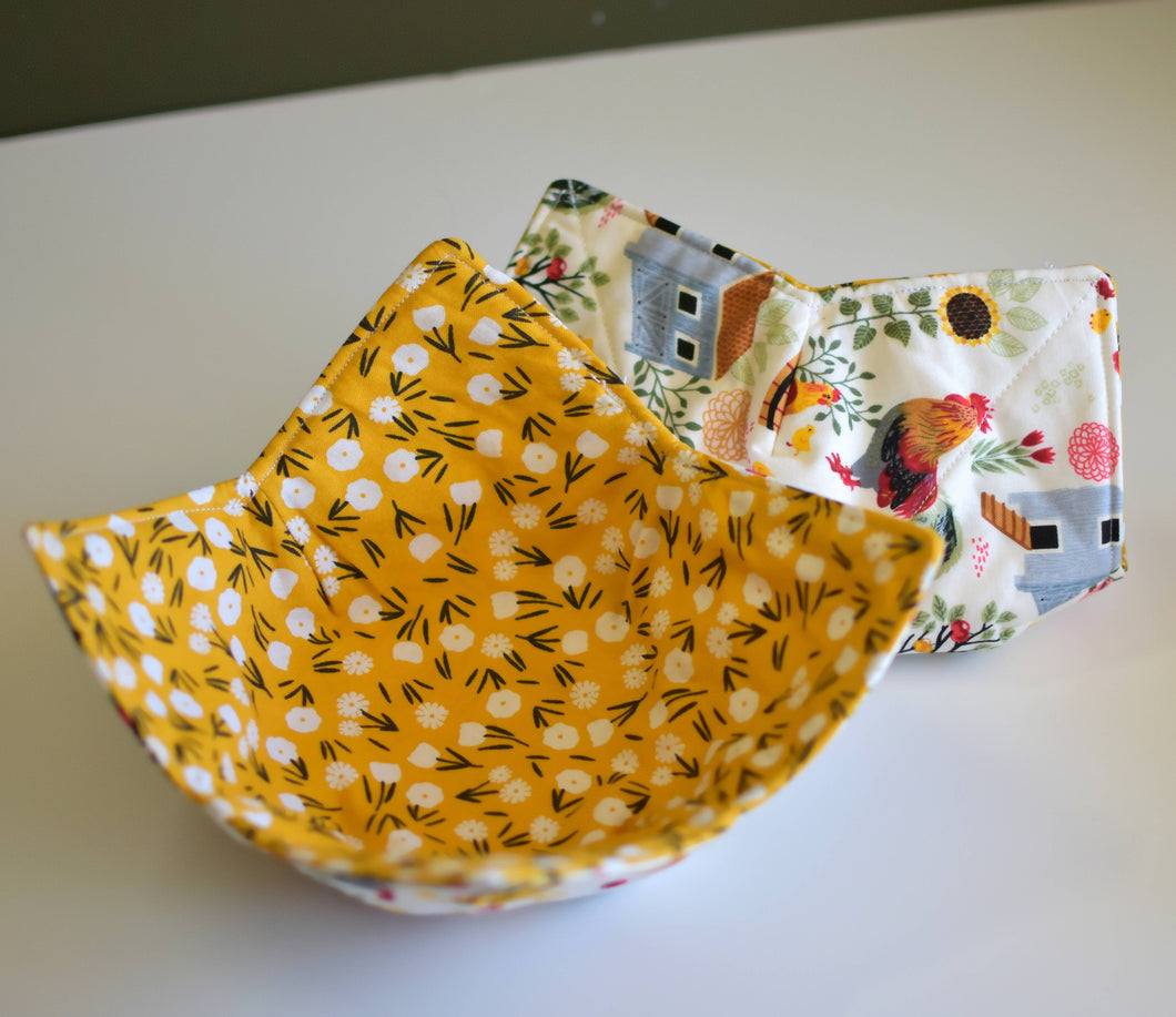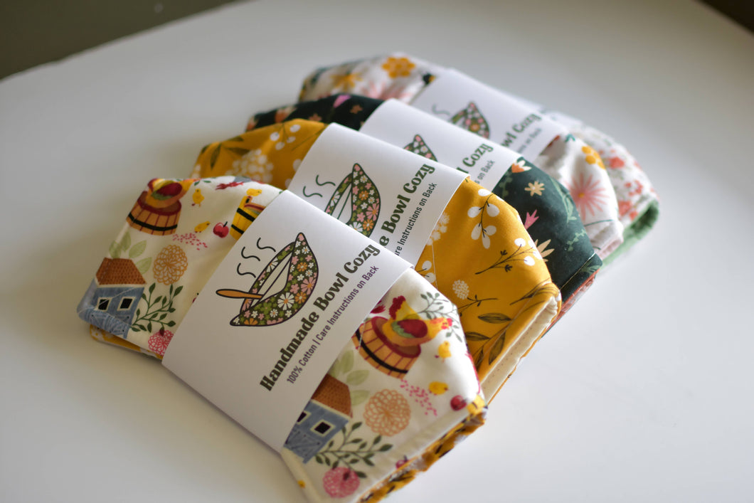 Bring a warm touch of rustic charm to your kitchen with this handmade farmhouse bowl cozy! Adorned with vibrant roosters, sunflowers, barns, and floral details, this cozy combines function with farmhouse style. Use it to safely handle hot soup, oatmeal, or microwave meals, or keep your hands comfy while enjoying cold treats like ice cream or smoothie bowls. Every item is Handmade by The Hippie Stitchie Each Cozy is reversible with coordinating fabrics on each side Made with 100% cotton microwave safe materials Quilted with two layers of cotton batting for insulation and durability Eco-Friendly: sustainable and reusable kitchen accessory Perfect For: Hostess and Housewarming gifts Mother’s Day, birthdays, holidays Eco-friendly reusable kitchenware Whether you're treating yourself or gifting a soup loving friend, this cozy is as cute as it is practical! Dimensions (measured from corner to corner) approx. 5” base with 9” top