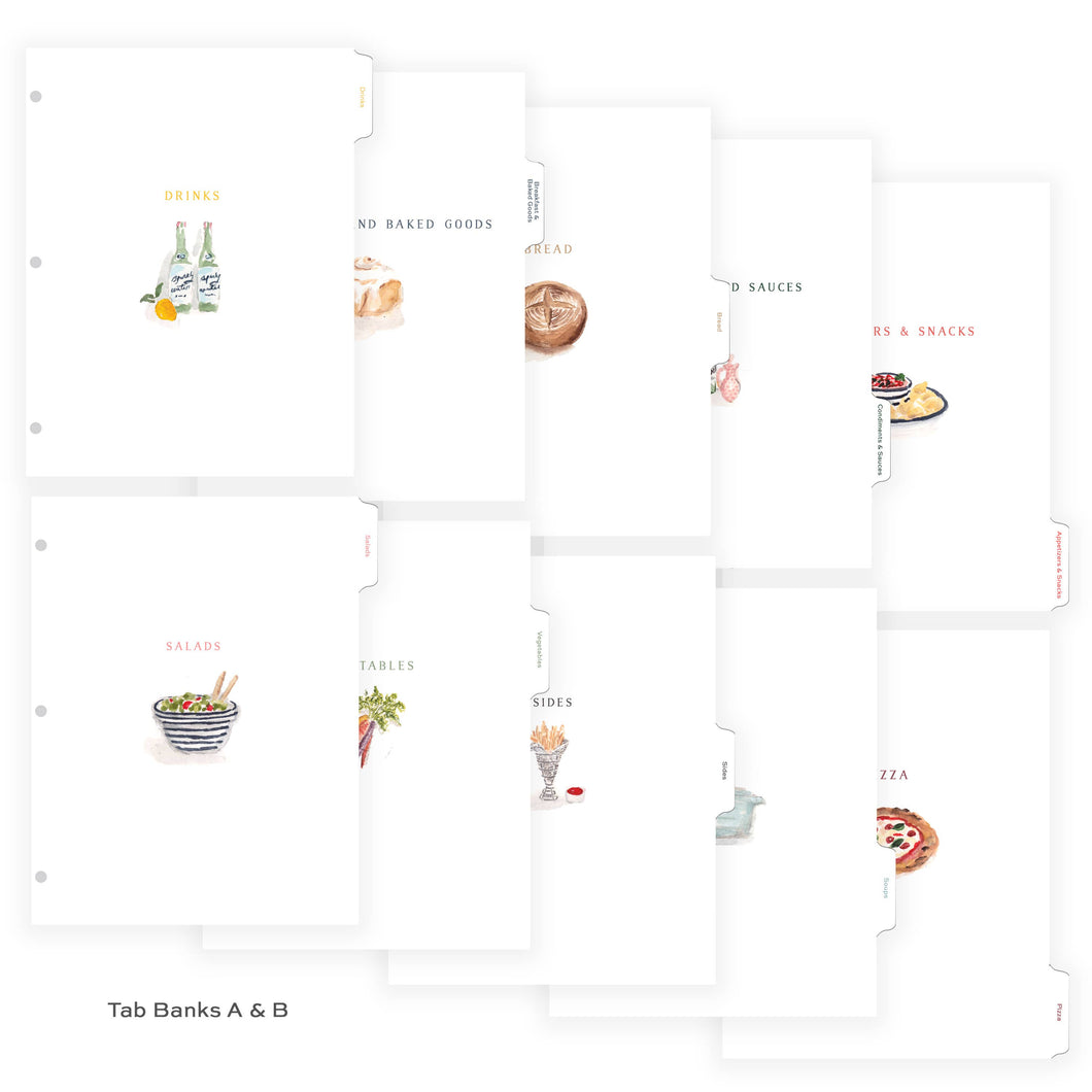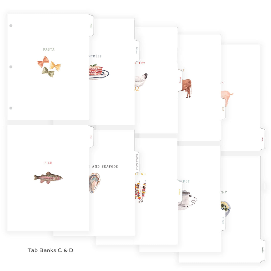 Expand your recipe organizing horizons with 20 categories of food--more than twice the number in our original set with a special emphasis on entrees and meats. Four banks of 6 tabs. CATEGORIES First bank: - Drinks - Breakfast & Baked Goods - Bread - Condiments and Sauces - Appetizers and Snacks - Salads Second bank: - Vegetables - Sides - Soups - Tacos - Pizza - Pasta Third bank: - Casseroles - Poultry - Beef - Pork - Lamb - Fish Fourth bank: - Shellfish - Grilling - Pressure & Slow Cooker - Preserving & Freezing - To-Try - Healthy