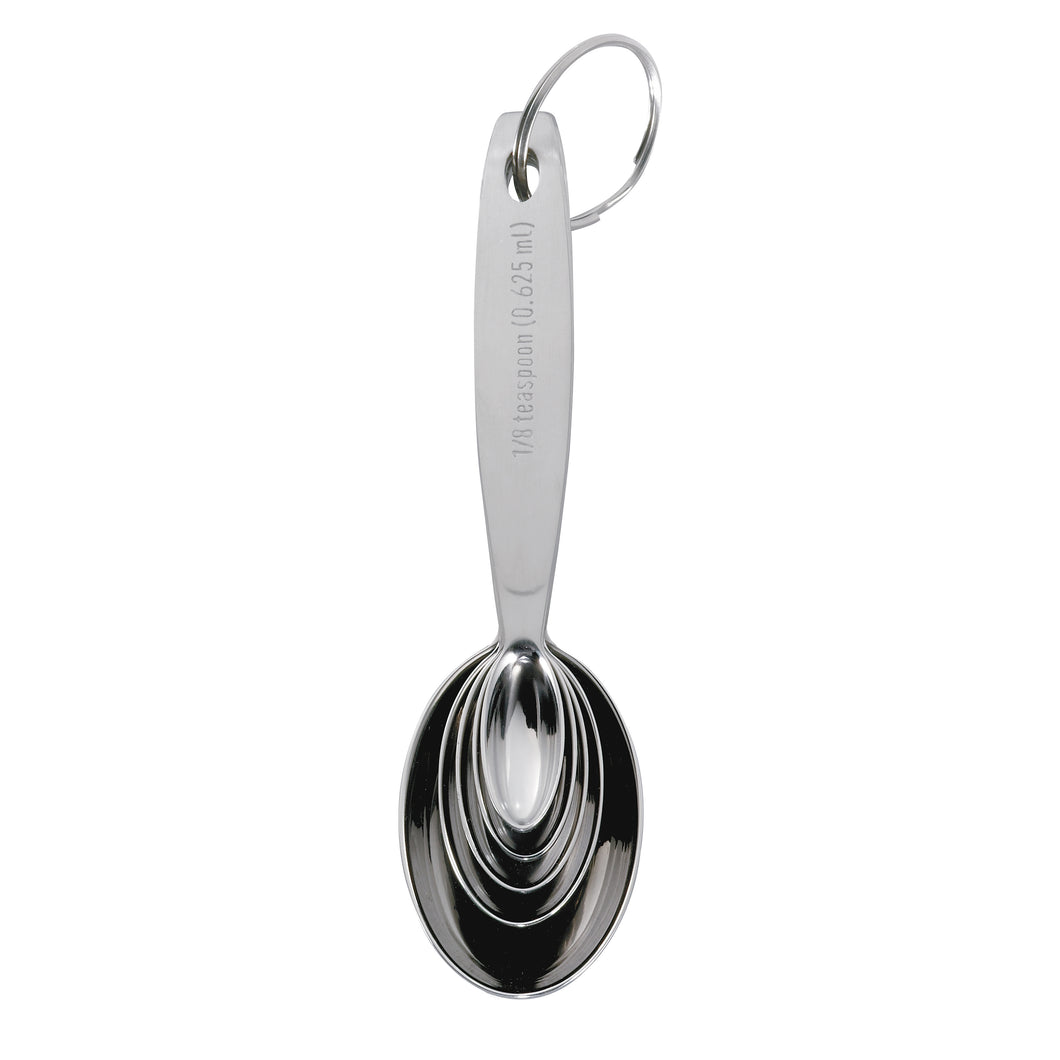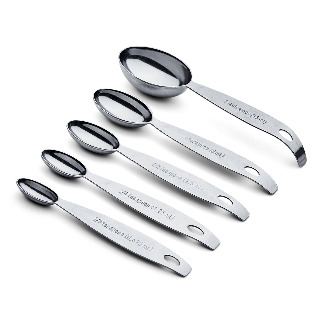 Recommended by professionals, our innovative set of five measuring spoons fit together neatly and are held together with a simple storage clip. These superb nesting measuring spoons are oval so you can reach into the smallest spice jar.