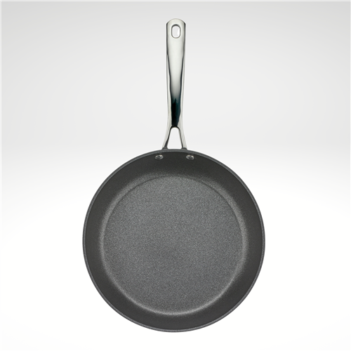Introducing our eco-friendly Intense Pro Fry Pan, crafted from 100% recycled aluminum for optimal heat transfer. Its full induction bottom saves energy and time. With a 3-fold non-stick coating infused with Swiss mountain crystal particles, it's easy to clean and use with stainless steel kitchen gadgets. Oven-proof, dishwasher-safe, and suitable for all stove types. Cooking made efficient and sustainable.