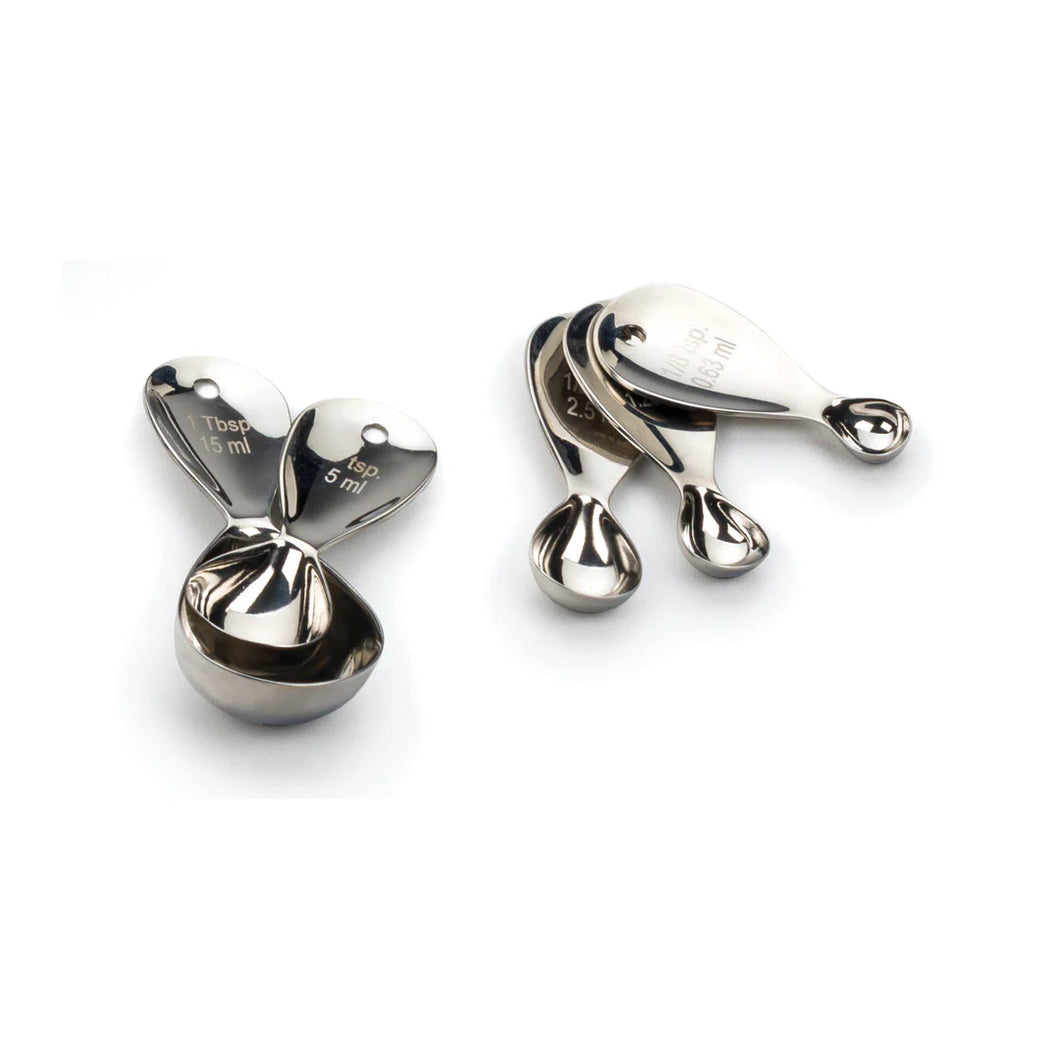 Set includes 1-tablespoon, 1-teaspoon, 1/2-teaspoon, 1/4-teaspoon, and 1/8-teaspoon.