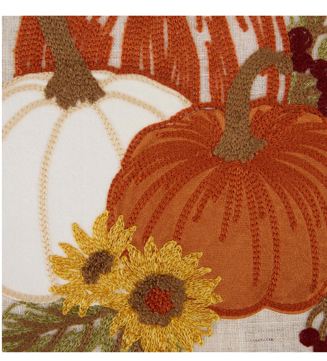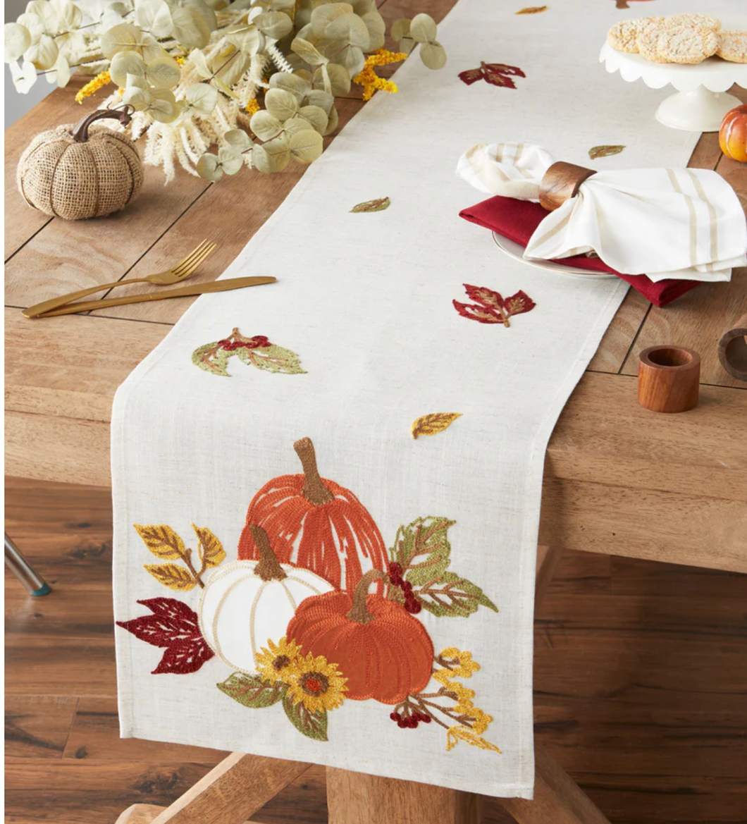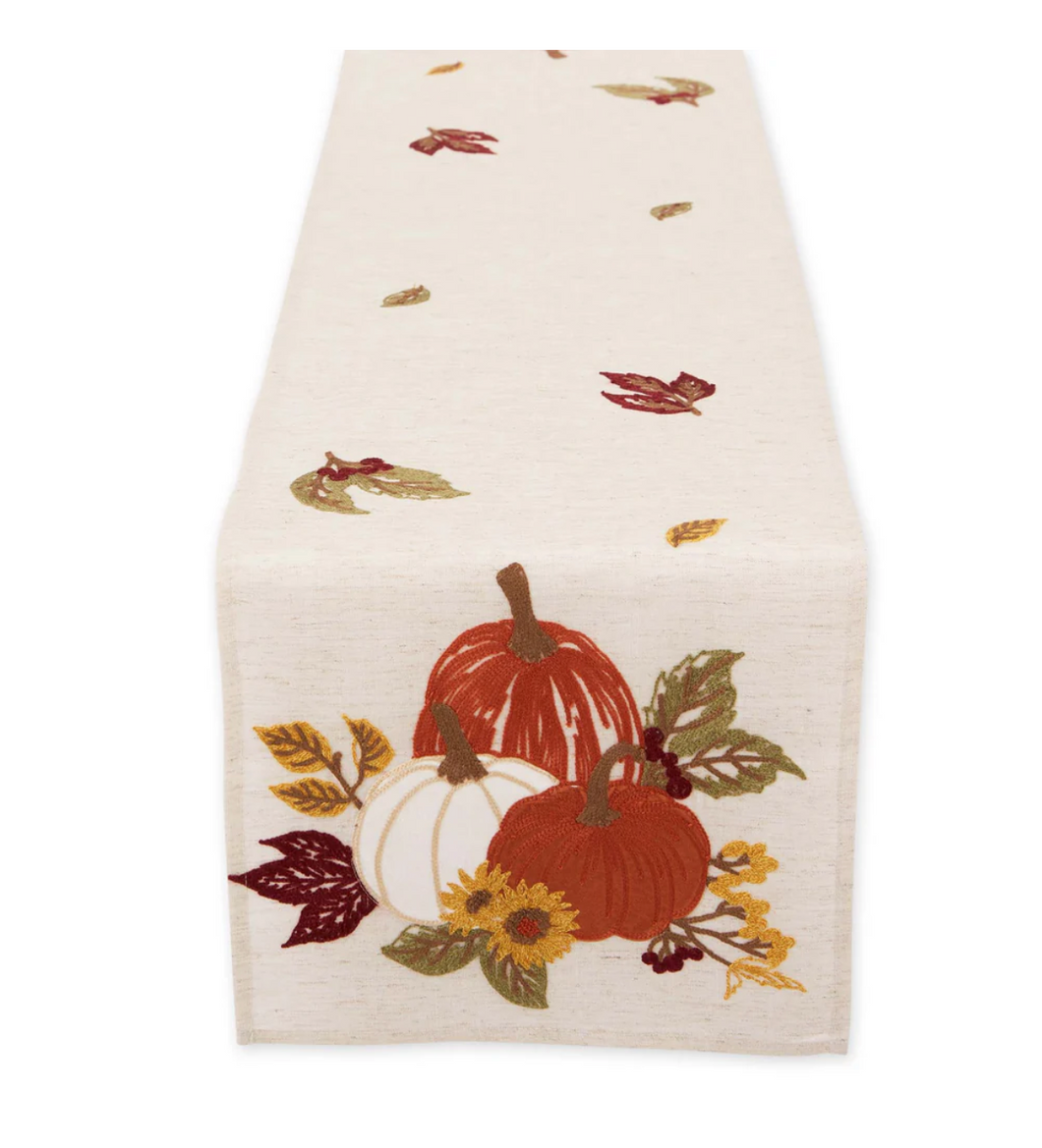 This Autumn inspired table runner features decorative embroidered fall foliage and pumpkins adding visual interest and interest to your tabletop.