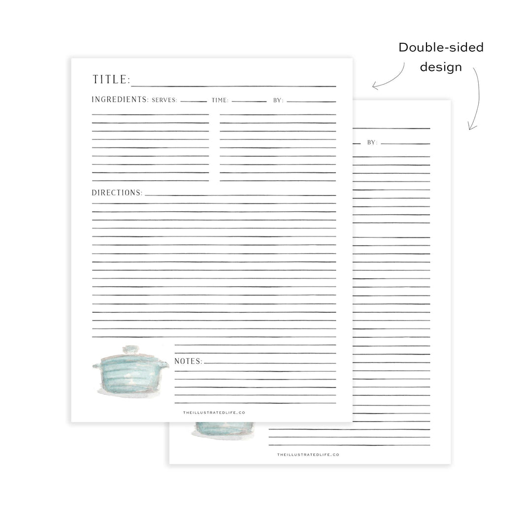 Use these full-size pages like jumbo recipe cards for those extra long recipes! - Choose from three styles, pink (mixer), copper (mixer), or blue (dutch oven) - Set of 10 double-sided sheets - 8.5x11 inches - Printed on 120 lb eggshell stock - Punched with three holes for a standard binder - Packaged in clear cellophane with a branded label