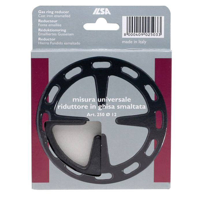 Ilsa's Gas Ring Reducer quickly decreases the size of gas burner openings in center grates so that smaller cookware and accessories have a stable cooking surface. Made in Italy from cast iron, Ilsa's Gas Ring Reducer is easily placed over the gas burner to eliminate unsteady cooking conditions for better kitchen safety practices. The cast iron is durable, sturdy, and absorbs then diffuses heat evenly for greater energy efficiency. It's ideal for use under smaller cooking vessels and accessories, like sauce pans, tea kettles, butter warmers, Turkish warmers, omelette pans, stove-top coffee makers and espresso pots, flame-safe measuring cups, and more. Made in Italy from cast iron, Ilsa's Gas Ring Reducer is durable, sturdy, and compact for easy storage. Measures 5-inches in diameter. Wipe clean or hand wash in warm, soapy water and dry thoroughly.