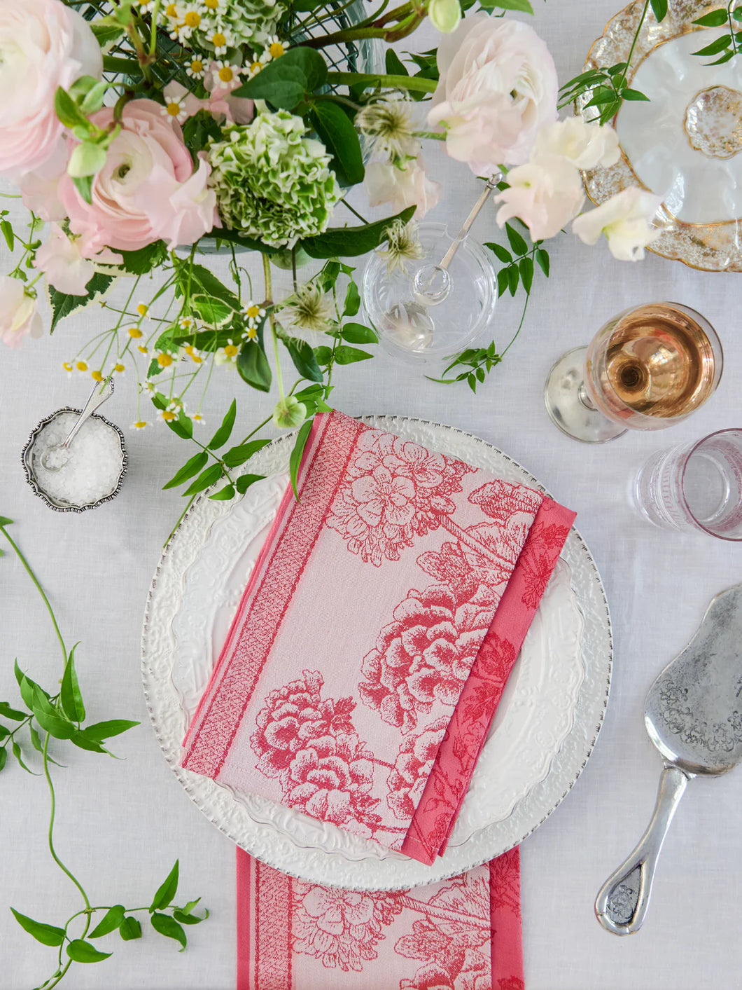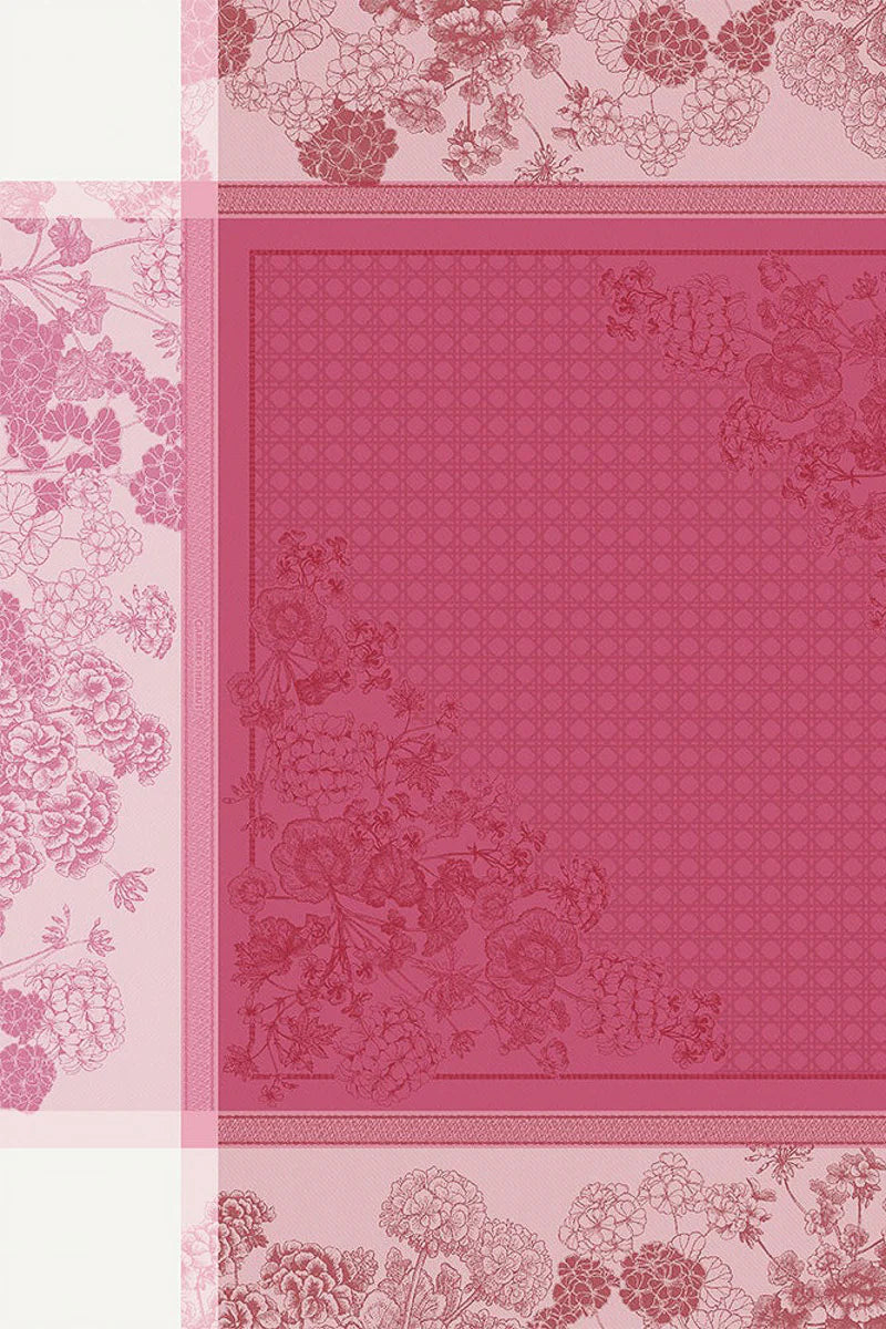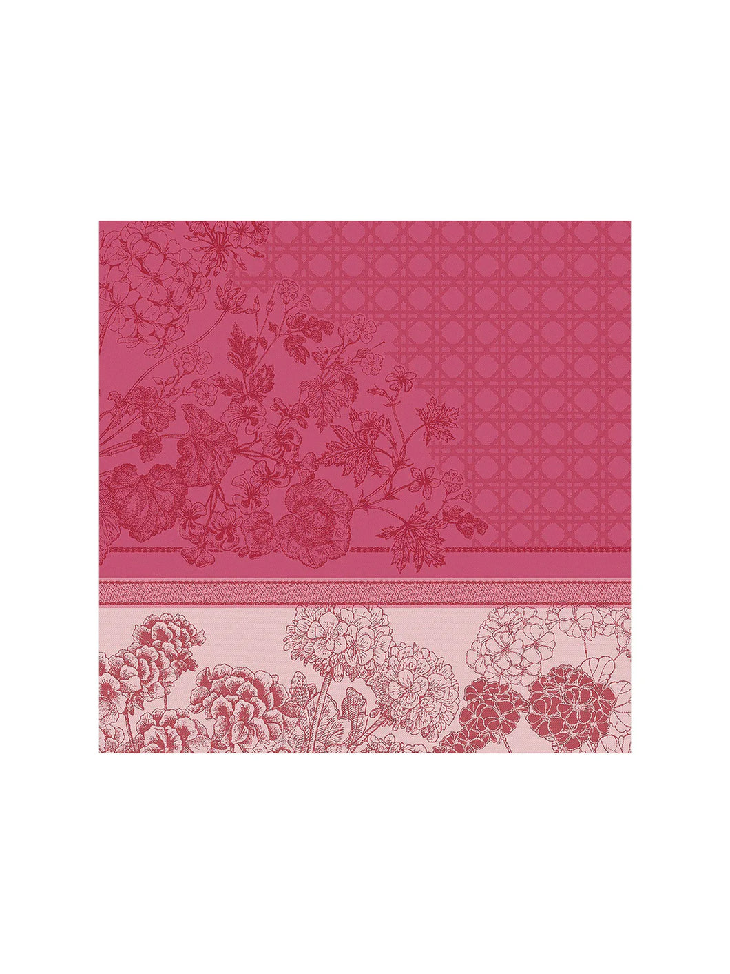 A summer pink extravaganza of geraniums on a 100% cotton jacquard table linen collection for adding a pop of color to the tablescape that is finished with an eco-friendly stain-resistant treatment.