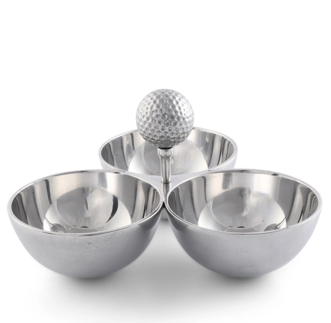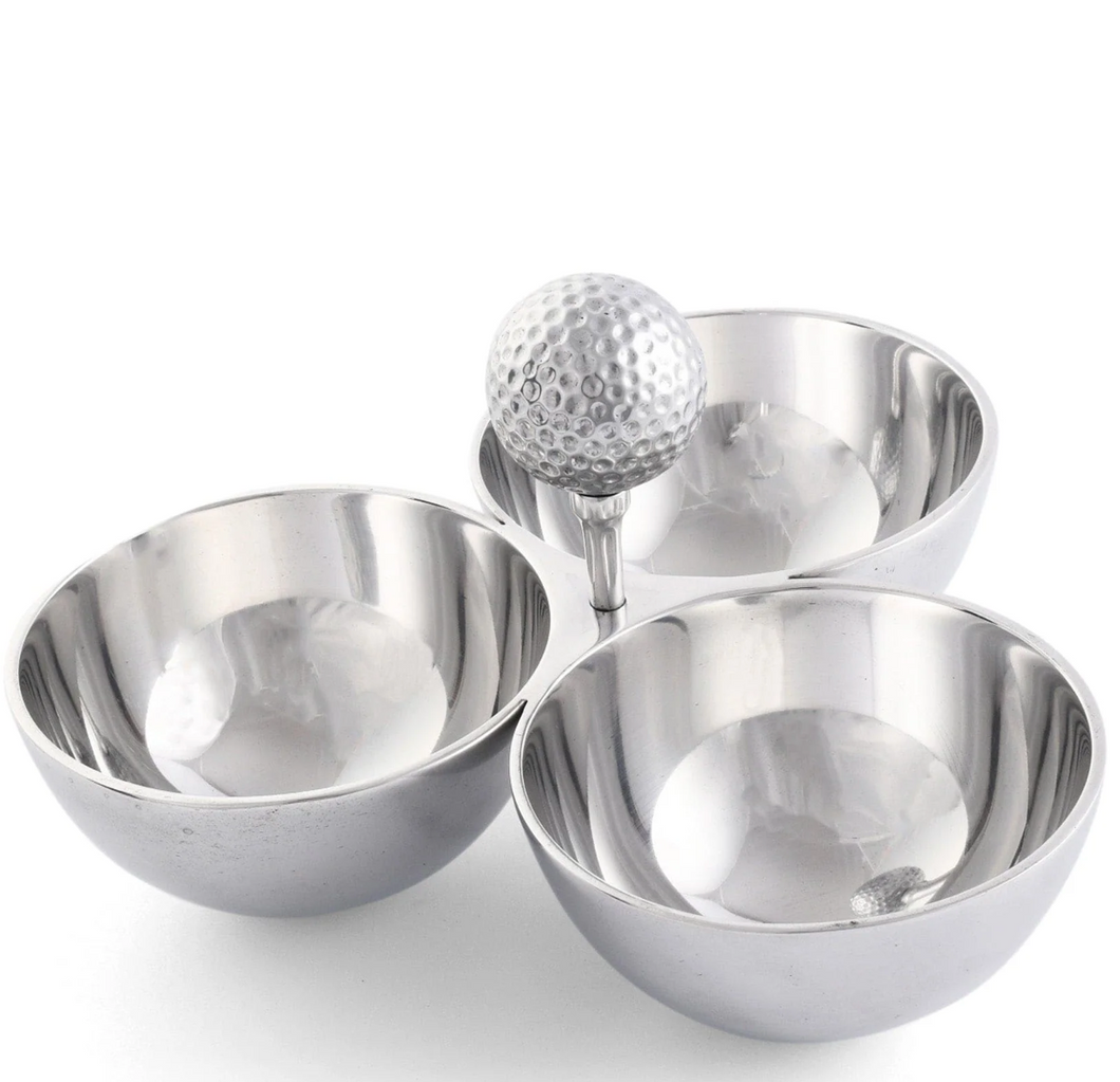 Elevate your hosting game with this sophisticated and versatile Golf Ball Handle Metal Nut Bowl, a perfect blend of style and functionality. Crafted with meticulous attention to detail, this nut bowl stands out with its unique golf ball handle, making it an eye-catching piece for any gathering or event. This metal nut bowl is not just a serving dish; it's a statement of elegance and a nod to the game of golf. The golf ball handle is skillfully integrated into the design, offering a touch of whimsy and sophistication that is sure to spark conversation among your guests. Whether filled with nuts, candies, or other small snacks, this bowl adds an element of luxury to your entertaining. The quality of craftsmanship is evident in every aspect of the bowl, from the smooth finish of the metal to the precise detailing of the golf ball handle. This careful attention to detail ensures that the bowl is not only beautiful but also durable, ready to serve you and your guests at countless gatherings. Perfect for any party, especially those with a golf theme, this nut bowl is versatile enough to fit into any setting, from casual get-togethers to more formal affairs. It's an ideal gift for golf enthusiasts, or anyone who appreciates the blend of utility and sophisticated design in their serveware. This Golf Ball Handle Metal Nut Bowl is more than just a functional item for your home; it's a piece that reflects a love for the sport and an appreciation for refined design. It's an excellent addition to your collection of serveware, ensuring that you’re always ready to host with style and elegance.