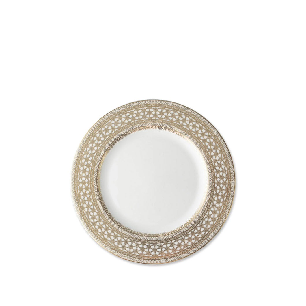 Hawthorne Gilt wears bands of highly detailed, semi-burnished gold with the look of the finest filigree jewelry. On creamy white bone china the pattern softly reflects light to create a table of sophisticated simplicity. This lovely small plate is perfect for bread and butter, appetizers, or desserts.