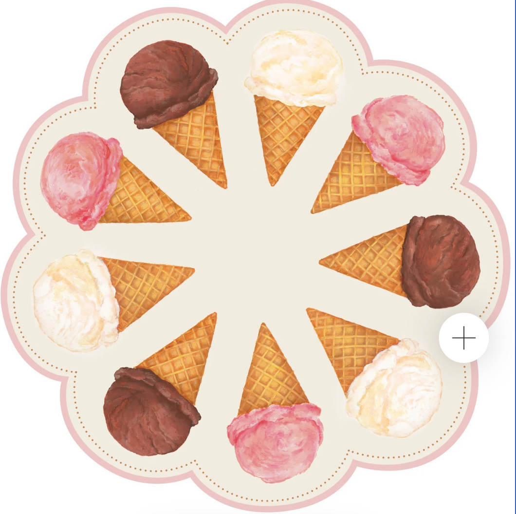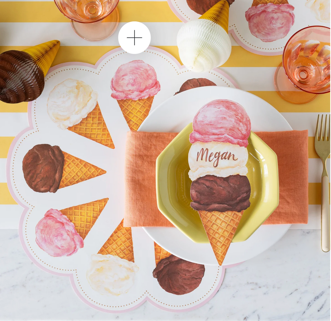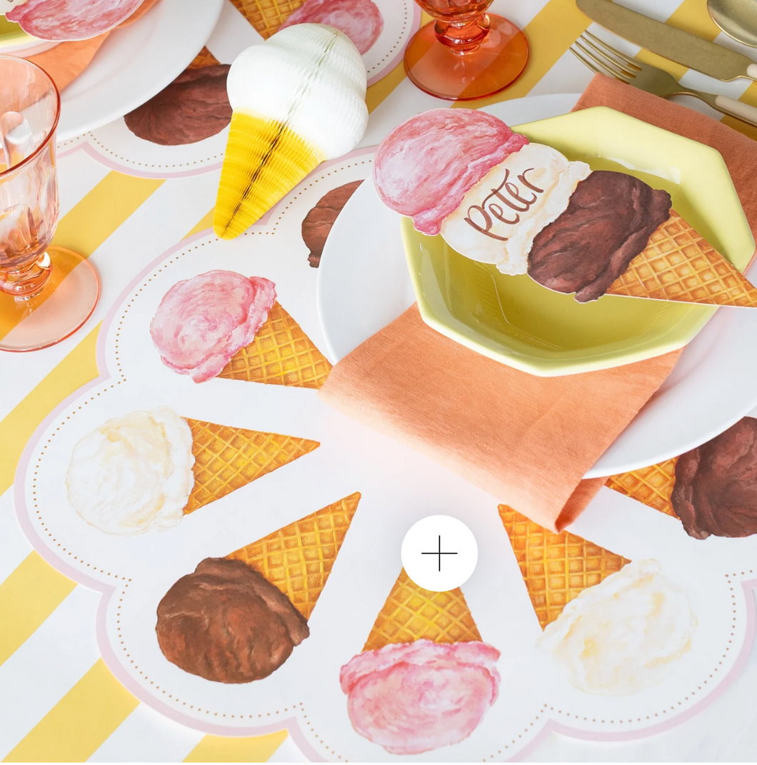 Which flavor to choose? This charming circle of ice cream cones is the perfect place to put your plate for a sweet celebration. Our paper placemats add an elegant touch to any tablescape.