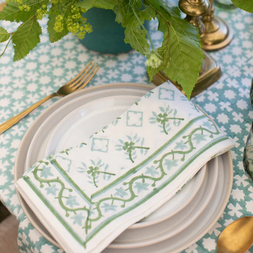 The delicate floral pattern from these tiles, now hand block printed in soothing Palladian Blue and Soft Sage, adorns these napkins. Ideal for both casual and formal gatherings, adding a touch of elegance to any setting.