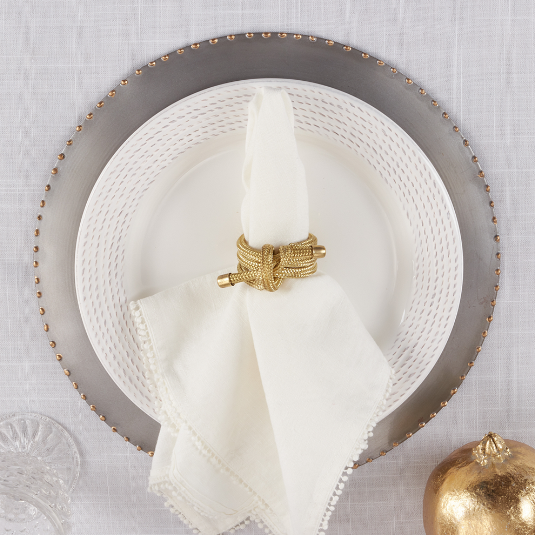 This gorgeous set of Knotted Rope Napkin Rings is the perfect finishing touch for your place settings. The double rope and knot design brings a lovely weight and texture, while the knot adds dimension. The set is easy to pair with a wide range of tableware.