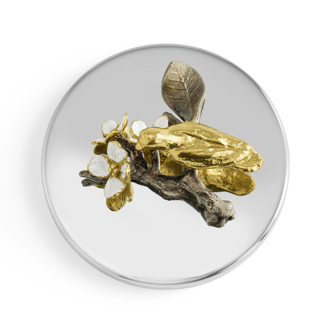 The Lovebirds Collection celebrates love and the deeply engrained nature in us all to bond with one another. The branch that the birds perch upon symbolizes growth and evokes tree of life imagery. The white, four-petaled flowers represent wholeness, unity, and innocence.