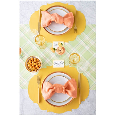 Set the scene for your table with our classic Die-cut Marigold French Frame Placemat. Made from a warm, yellow paper stock, this elegant frame creates a beautiful paper charger for your dinnerware. This placemat acts as a grounding piece for your table settings, and can be used on its own, or in combination with other everyday or seasonal favorites to create a welcoming tablescape.