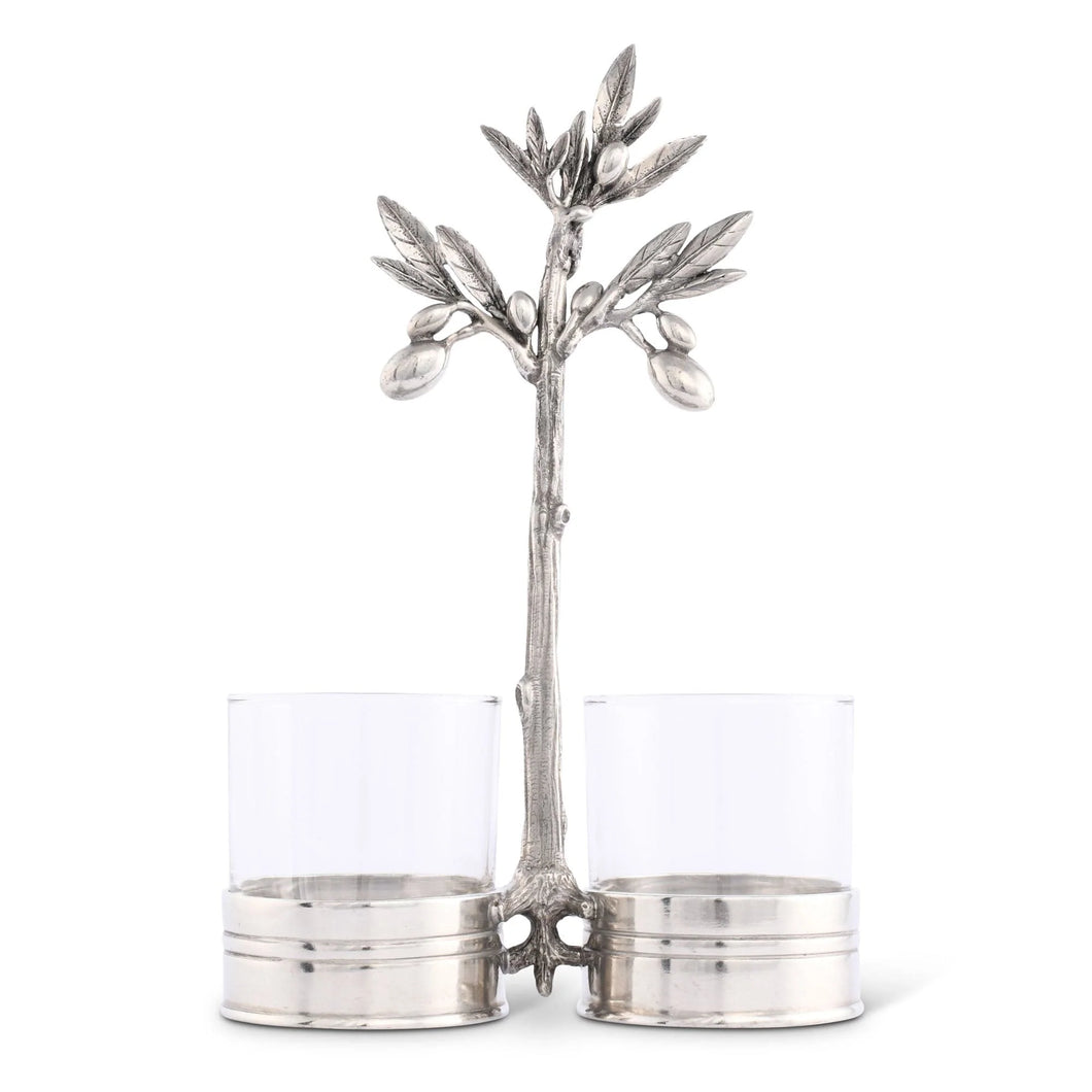A delicately detailed, pure pewter olive branch, laden with fruit and leaves, is the focal point of Vagabond House's Olive Grove Pewter Double Condiment Server. The branch is both the handle and the join for two, banded pewter cups which hold the glass condiment jars.