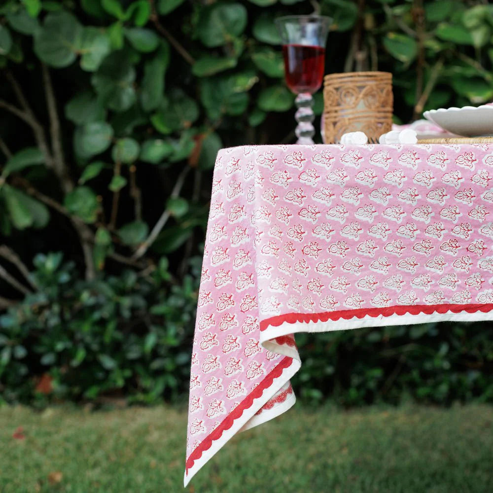 Transform your table into a celebration of color with our Pom Buti Pink Tablecloth. This hand block-printed piece showcases a charming floral motif against a soft pink background, framed by a red scalloped border. Perfect for entertaining or simply elevating everyday dining, this tablecloth is a must-have for creating a warm and welcoming atmosphere.