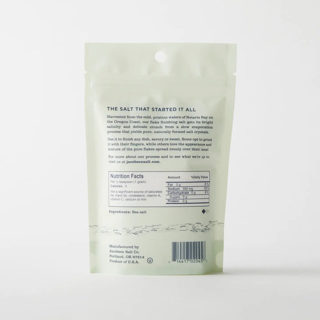 Our signature flake finishing salt is the product that put us on the map. Hand-harvested from the cold and pristine waters of netarts bay on the Oregon Coast, our flaky finishing salt has bright salinity and a delicate crunch. Use it to finish savory and sweet dishes alike. Add to sliced steaks and roasts, sprinkle on eggs, finish grilled vegetables, top baked goods, or add to anything that strikes you. Unit Net Weight: 4 oz Unit Dimensions: 6" x 4" x 1.5" Best Before: 3 years