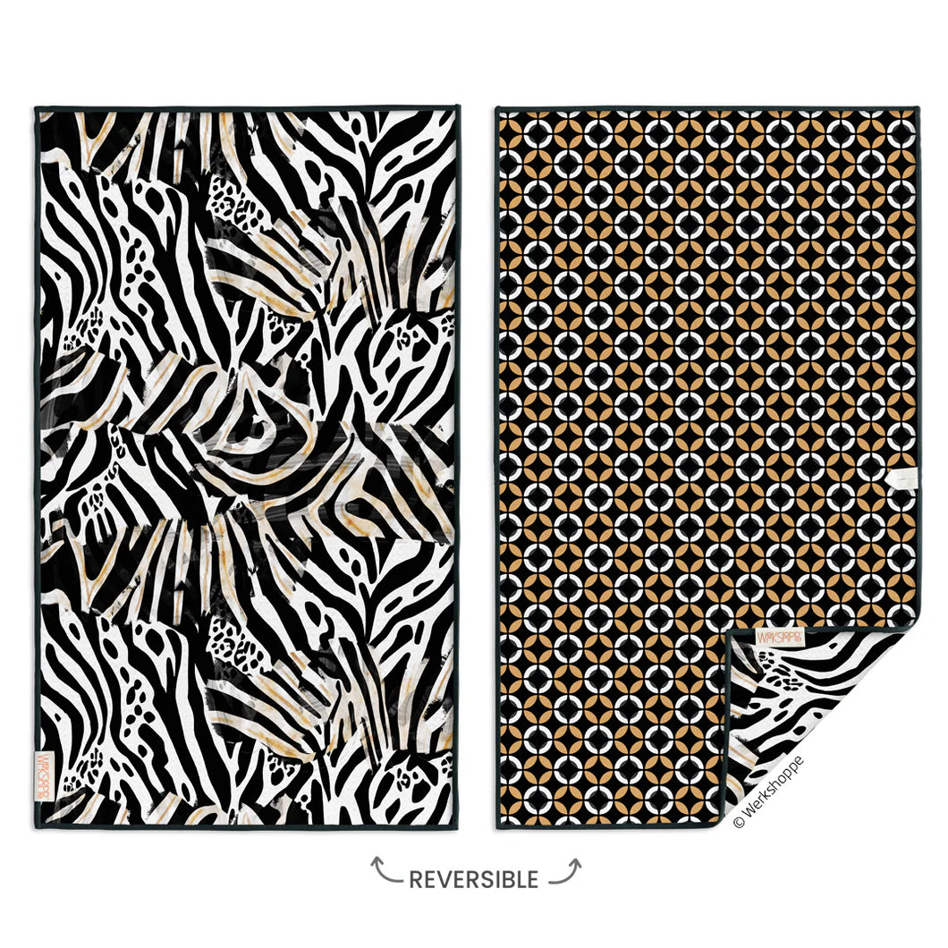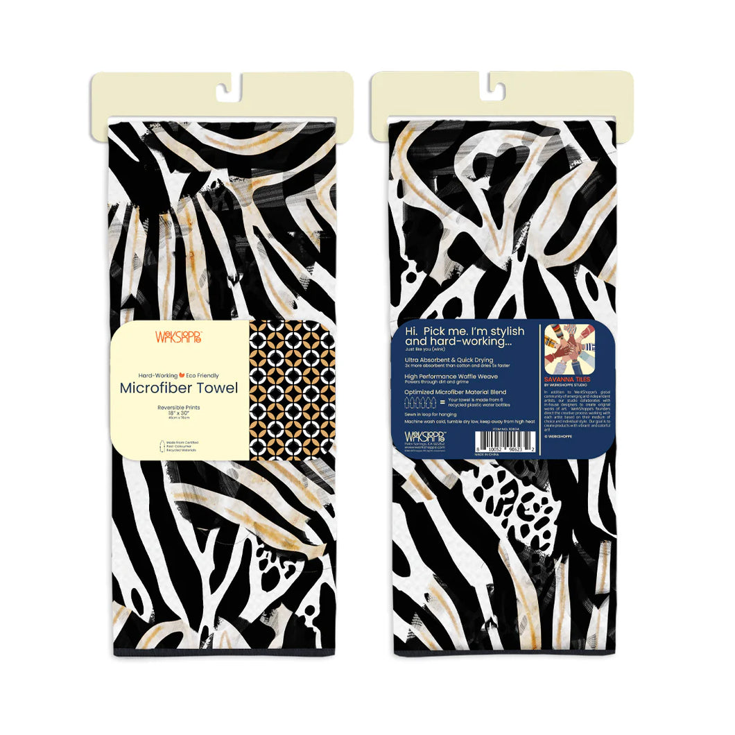 For the exotic animal lover, this stylized animal print coordinates with a modern haberdashery graphic for an attractive reversible microfiber hard-working towel.