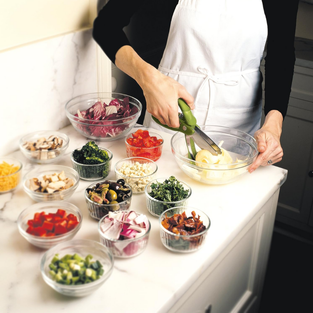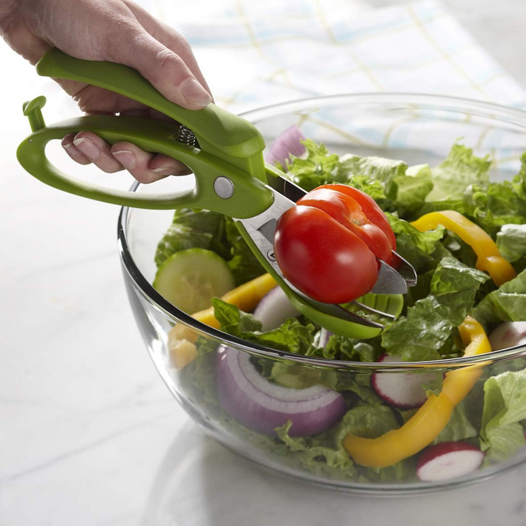Make a chopped salad today with the Trudeau Toss & Chop Salad Shears. With its ergonomic handles for comfort and ease of use and dual micro-serrated stainless-steel blades that will never need sharpening, toss and chop food directly in a bowl, plate or pan. The safety lock on the handle provides a secure and compact storage. Create fresh, healthy meals with greater convenience and minimal clean-up. Hand wash is recommended.