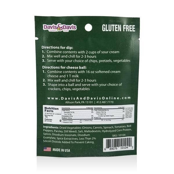 Although it says vegetable in the title, this dip mix is terrific with chips, pretzels, pita chips. Onion, garlic, a handful of herbs all combine for a well balanced delicious dip mix. Gluten-free. Dip mix directions: Combine the entire contents of a Davis & Davis dipper mix with 2 cups sour cream. Mix well and chill for 2-4 hours to allow the flavors to develop. Cheeseball directions: Combine the contents of a Davis & Davis dip mix with 16oz of room temperature cream cheese and 1 cup of shredded cheddar cheese. Blend well, chill. Shape into a ball or log and serve with crackers, pita chips. Salad dressing directions: Combine the contents of a Davis & Davis dip mix with 1c sour cream and 1/2 cup of buttermilk or regular milk. Blend well, chill for 2-4 hours to allow the flavors to develop. Serve alongside your salad.