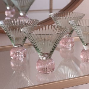 Cheers! Beautifully fluted, featuring lustrous colors and a spherical base, our GLASS Venice Martini  (Green and Pink) adds sparkle to any tablescape. Hand painted glass with a watercolor luster and brilliance enhances any sip. Made exclusively for Beatriz Ball. Hand wash with soft sponge and mild detergent using lukewarm water; wipe dry with soft cloth.